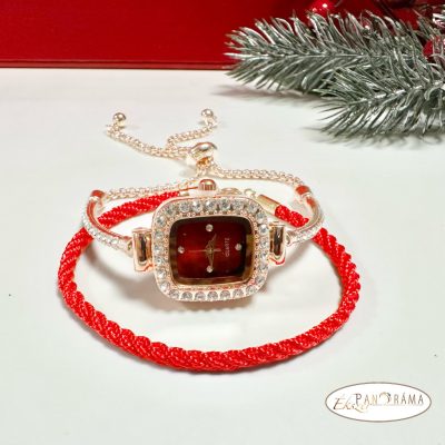 Ajándékcsomag - Ékszeróra Gold Filled zsinóros karkötővel, piros színben