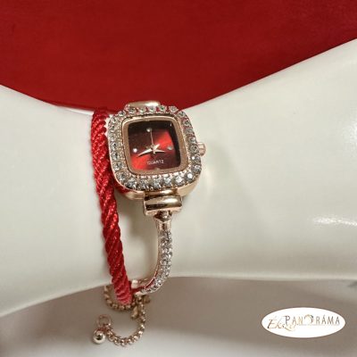 1. Női karóra, arany színű szögletes, piros számlapos, kristályos tokkal, fém kristályos szíjjal