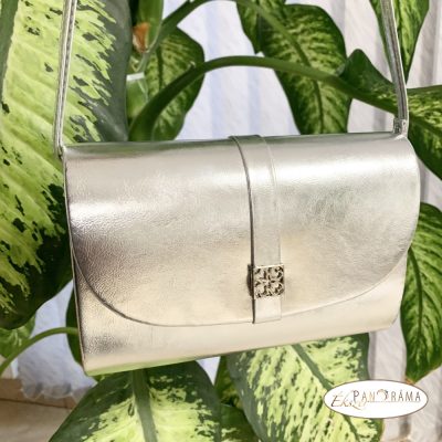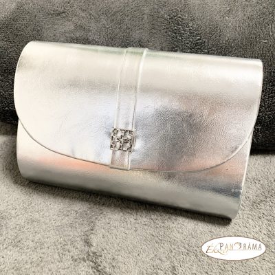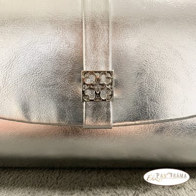 Igényes kidolgozású, női rostbőr alkalmi táska, ezüst színű, emblémával díszített