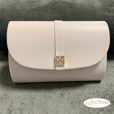 Igényes kidolgozású, női rostbőr alkalmi táska, púder rózsaszín színű, arany színű emblémával díszített