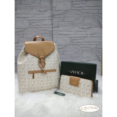 Igényes kidolgozású, női rostbőr háti táska, beige színben, verde feliratos díszítéssel.