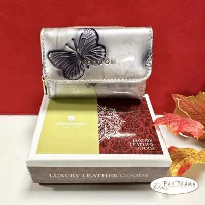 Női valódi bőr pénztárca Rfid védelemmel, ezüst színben, pillangó díszítéssel, díszdobozban- PETERSON MINI
