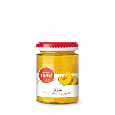 Nova sütőtökkrém, 190 g. Összetevők: tök 79%, napraforgóolaj, burgonya, cukor, rizskeményítő, só, dehidratált hagyma, bors, aromák,