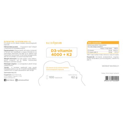 A Nutri Nature – D3+K2 adagonként 2000 IU D3-vitamint és 50 µg K2-vitamint tartalmaz.