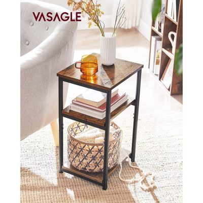 • MIT KAP: Ipari stílusú oldalasztal 3 nyitott polccal a kényelmesebb tárolás érdekében, amely oldalasztalként és éjjeliszekrényként is használható