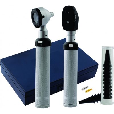 Oto-Oftalmoszkóp készlet LED izzó technológiával és az AUG OPTIKA Rheostat nyél szuper kombinációjával, 1 komplett otoszkóp, 1 komplett oftalmoszkóp készülék nyéllel műanyag tokban, eldobható fültölcsérekkel és pótlámpával.