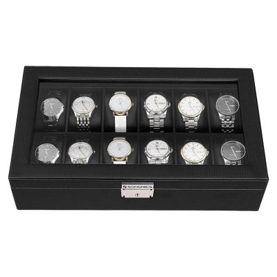óradoboz 12 rekesszel, nagy óradoboz üvegtetővel, PU burkolat, bársony bélés, fém csattal, fekete: