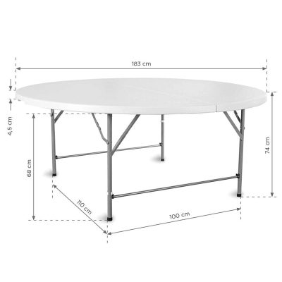 Egy szilárd, funkcionális és stabil eseményasztal. A teteje rendkívül tartós polietilénből készült. Az asztallap átmérője: 120 cm. Egy különleges összecsukható rendszernek köszönhetően az asztal bőrönddé hajtható össze, és maga a hajtogatás néhány másodpercet vesz igénybe. Ez a funkcionalitás lehetővé teszi az asztal könnyű tárolását és problémamentes szállítását. Az asztal megengedett terhelése 200 kg! Egy további zárómechanizmus védi az asztalt az esetleges véletlen összecsukódástól, és a lábak gumitalpakkal vannak ellátva a felületek karcolódásának megelőzése érdekében, valamint az asztal csúszásának megakadályozására. A váz porbevonattal ellátott acélból készült.