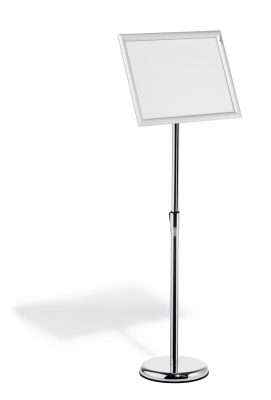 • Ezüst színű információs állvány, amelynek stabil DIN A4-es alumínium kerete van és gyorsan összeállítható
