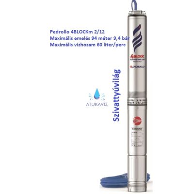 4BLOCKm 2/12 búvárszivattyú maximális vízszállítása 60 liter percenként és zárónyomás értéke vagyis a teljes emelési magassága 94 méter, 9.4bár. Üzemi vízszintet tekintve a 4BLOCKm 2/12 búvárszivattyú 35-45 méter mélyre telepíthető és zárónyomáskén marad 5,9-4,9 bár zárónyomás. Házi vízellátáshoz, öntözéshez alkalmas lehet. Azért csak lehet mert minden rendszernek más az igénye. Minden esetben egyeztessen szerelőjével vagy öntöző rendszer tervezőjével! Ezekben a mélységekben a 4BLOCKm 2/12 szivattyú vízszállítása a maximális vízszállításhoz, közel van 50-60 liter percenként. Ne felejtsünk el számolni a veszteségekkel! A bban az esetben ha a 4BLOCKm 2/12 búvárszivattyút vezérlés nélkül csak vízátemelésre vagy teljes átmérős (slagos) locsolásra alkalmazunk 60-70 méter mélyre is telepíthető. Ebben a mélységben is 40-30 literes vízszállításra képes. 4BLOCKm 2/12 csőbúvár szivattyú vezérelhető nyomáskapcsolóval vagy áramlásvezérlővel hidrofor tartállyal vagy tartály nélkül. A szivattyú teljesítményét befolyásolja a felette elhelyezkedő vízoszlop!