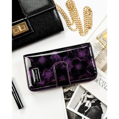 Nagy, piros női pénztárca virágokkal, lakkbőrből, patenttal és cipzárral, Peterson