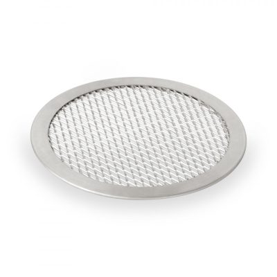 A 50 cm átmérőjű perforált kerek alumínium pizzasütő.