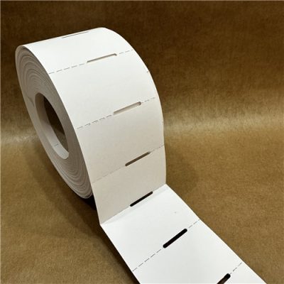 Tekercses nyomtatóval nyomatatható perforált kartoncímke.