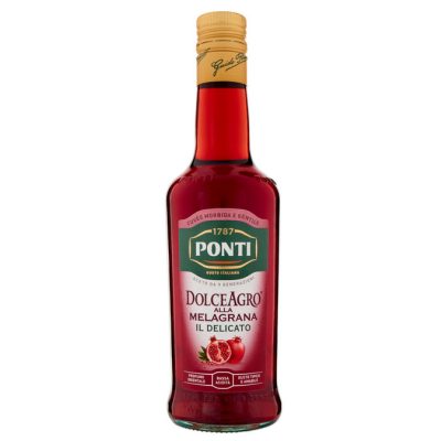 Ponti gránátalma ecet, 500ml, Gluténmentes. Használja fehér húsokhoz és grillezett halhoz. Meglepően jó a szomjúságcsillapításhoz, ha szénsavas vízzel hígítjuk. Összetevők: borecet, finomított mustsűrítmény (szulfitok), gránátalmalé sűrítményből 17%, természetes aroma. Átlagos tápérték 100g termékben: Energia: 496 kJ/ 116 kcal, Zsír: 0 g, ebből telített zsírsavak: 0 g, Szénhidrát: 26 g, ebből cukrok: 26 g, Fehérjék: 0 g, Só: 0.01 g. Minőségét megőrzi a csomagoláson feltüntetett időpontig. Hűvös, száraz helyen tárolandó. Származási ország: Olaszország. Forgalmazó: Milis Faplusz Kft., 8092 Pátka, Gárdonyi u. 36