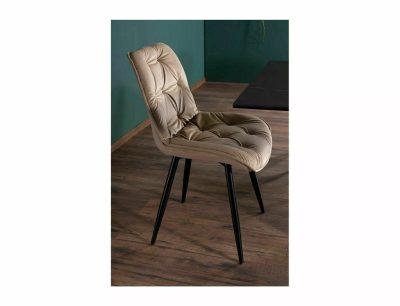 A Praga Velvet étkezőszék a modern design és a klasszikus kényelem tökéletes ötvözete. A szék puha, sötétbézs bársony kárpitozása és steppelt háttámlája luxus megjelenést kölcsönöz. A fekete matt fém váz karcsú, szögletes lábai stabil alapot biztosítanak, miközben légies megjelenést kölcsönöznek a széknek. A háttámla ergonomikus kialakítása és a kényelmes ülőfelület hosszú étkezésekre is ideális választássá teszi.