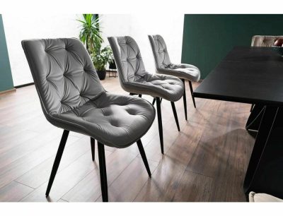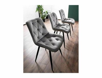A Praga Velvet étkezőszék a modern design és a klasszikus kényelem tökéletes ötvözete. A szék puha, szürke bársony kárpitozással és stílusos fekete matt fém lábakkal rendelkezik. A háttámla és az ülőfelület gyémántmintás tűzése nem csak esztétikai elem, hanem extra kényelmet is biztosít. A szék 84 cm magas, 49 cm széles, és az ülőmagassága 48 cm, ami ideális az étkezőasztal mellé.