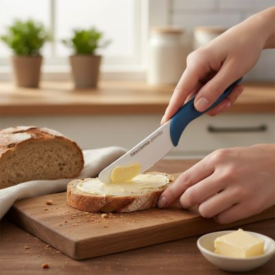 • Praktikus és sokoldalú: A vajkés nemcsak vajhoz használható, hanem más kenhető élelmiszerekhez, például margarinhoz, sajtkrémhez, pástétomokhoz, lekvárokhoz és mézhez is.