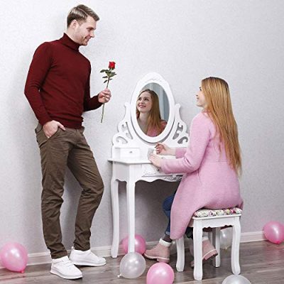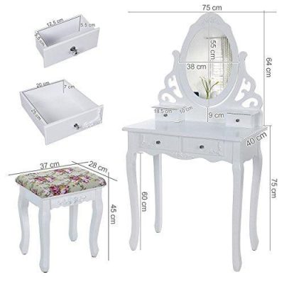 Princess fésülködőasztal paddal szett és 360 fokban elforgatható tükör sminkasztal 4 fiókos pipere bútor Könnyen összeszerelhető Hálószoba Fehér: