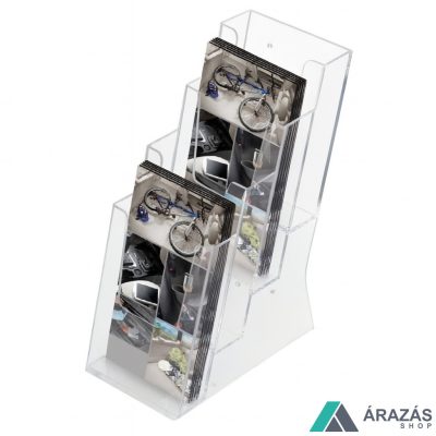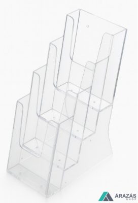 Ebbe a 4 rekeszes szórólaptartóba akár 4 különböző 1/3 A4-es minikatalógus vagy termékleírás helyezhető ki. Kialakításának köszönhetően egyaránt helyezhető asztalra, pultra vagy szerelhető fel a falra. Javasoljuk iskolákba, gyógyszertárakba, várókba.