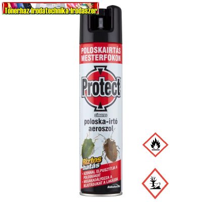 Felhasználható: Telelési céllal zárt térbe (lakásba) behúzódó címeres poloskák irtására. Használati utasítás: A készítmény kizárólag a lakásba behúzódó címeres poloskák irtására, az alábbi módokon használható: 1. Megelőzési céllal, felületkezelésre: A palackot függőlegesen tartva, kb. 30 cm távolságból permetezze le célzottan azokat a felületeket, ahol a poloskák bejuthatnak a lakásba, illetve ahol megbújhatnak a lakáson belül. Egyenletes, folyamatos fújással annyi permetet juttasson a kezelendő felületre, hogy az enyhén nedves legyen, majd hagyja megszáradni. Ne használjon indokolatlanul nagy mennyiséget. 1 palack (400 ml) aeroszol kb. 7 m² felület kezelésére elegendő. Kezelje: - az ajtók és ablakok keretét, a nyílászárókat határoló falfelületeket, párkányokat, könyöklőket - szúnyoghálók teljes felületét - redőnyöket/redőnytokokat - a faláttöréssel szerelt berendezések (pl. légkondicionáló, páraelszívó, konvektor, stb.) kivezető csöveinek környékét, - a poloskák rejtekhelyéül szolgáló réseket, repedéseket, valamint - bútorok, berendezési tárgyak mögötti falfelületeket Az optimális hatás érdekében a kezelést a poloskák első észlelésekor kezdje meg. Ezt követően javasolt 2 hetente megismételni az eljárást. 2. Közvetlenül a rovarra juttatva: A palackot célzottan a poloskára irányítsa, majd kb. 30 cm távolságból pár másodpercig juttassa a permetet a rovarra. A termék az irtószerrel való érintkezés után néhány percen belül fejti ki az ölőhatását. Ne használjon több irtószert a feltétlenül szükségesnél, indokolatlanul! A telelési céllal a lakásba bejövő poloskák elleni hatékony védekezés elengedhetetlen része a mechanikai védekezési módszerek alkalmazása, vagyis a nyílászárók hálózása, valamint az épület falain és tetőszerkezetén fellelhető - technológiai vagy anyaghibából eredő - folytonossági hiányok kijavítása! A Protect® címeres poloska-irtó aeroszol alkalmazása ezen óvintézkedések megtétele mellett, kiegészítő jelleggel javasolt. A készítmény repülő rovarok (pl. legyek, szúnyogok) irtására, a légtérbe porlasztva nem használható!