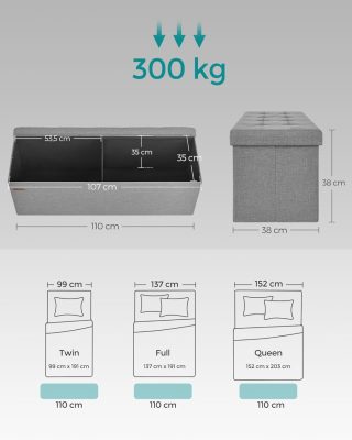 pad tárolóhellyel, ülő pad, zsámoly, összecsukható, 110 x 38 x 38 cm, vászonhuzat imitáció, hálószobába, előszobába, nappaliba, világosszürke