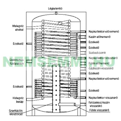 Az alsó hőcserélőbe kötheti be a napkollektort, kazánt vagy hőszivattyút.