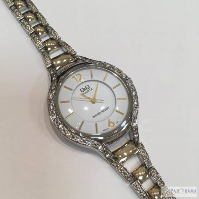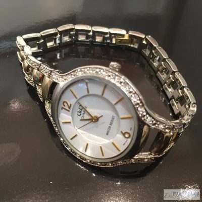 Ezüst és arany színű karóra, számlapja kerek, fehér hátlappal, arany számokkal, fém szíjjal, acél hátlappal! A számlapja kerek, 33 mm, Hossza max 21 cm, ami a szemek kivételével változtatható. Az órát teljes hosszában kristályok díszítik,