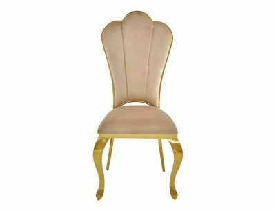 A Queen Velvet étkezőszék a luxus és kényelem tökéletes ötvözete. A szék háttámlája jellegzetes kagyló formájú, amely nem csak esztétikus, de kényelmes támaszt is nyújt. A bézs színű bársony kárpitozás puha tapintású és időtálló. Az arany színű, rozsdamentes acél váz különleges, ívelt lábakkal rendelkezik, ami királyi megjelenést kölcsönöz a széknek. A szék magassága 111 cm, ülésmagassága 49 cm, ami ideális az étkezőasztalhoz.