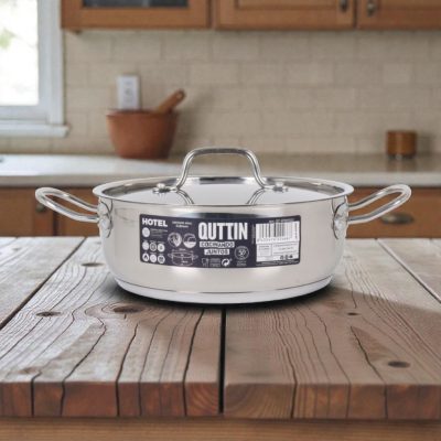 A Quttin Hotel lábas fedővel 3 literes egy 22 cm átmérőjű, 18/10-es rozsdamentes acélból készült edény, amely ideális közepes adagok elkészítéséhez. Vastag szendvics alja egyenletes hőeloszlást biztosít, és minden tűzhelytípuson – beleértve az indukciót is – használható.