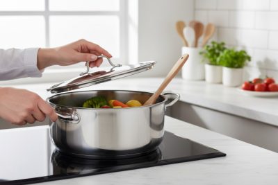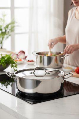 A Quttin Hotel lábas fedővel 7,5 literes egy 30 cm átmérőjű, prémium 18/10-es rozsdamentes acél edény, amely tökéletes választás, ha nagyobb mennyiségű levesről, pörköltről vagy tésztáról van szó. Vastag szendvics alja egyenletes hőeloszlást biztosít, és minden tűzhelytípuson – beleértve az indukciót is – kiválóan teljesít.