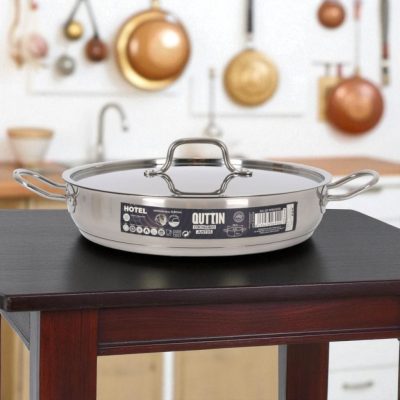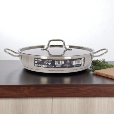 A Quttin Hotel szeletsütő lábas fedővel 4,3 literes egy 28 cm átmérőjű, alacsony falú rozsdamentes acél edény, amely kiválóan alkalmas húsételek, zöldséges fogások és egytálételek elkészítésére. A 0,8 mm falvastagság és a szendvics alj biztosítja az egyenletes hőeloszlást, bármilyen tűzhelyen – beleértve az indukciót is.