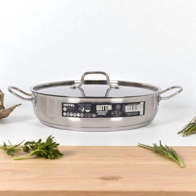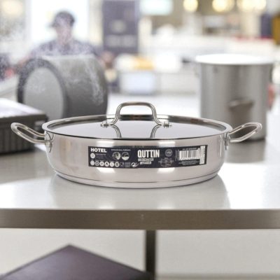 A Quttin Hotel szeletsütő lábas fedővel 5,3 literes egy 30 cm átmérőjű, alacsony falú, rozsdamentes acél edény, amely kiválóan alkalmas nagyobb adag hús, zöldség és egytálétel elkészítésére. A 0,8 mm falvastagság és a szendvics alj tökéletes hőeloszlást biztosít, bármilyen tűzhelyen – beleértve az indukciót is.