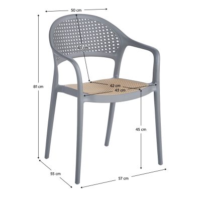 Anyag: műanyag Szín: szürke/bézs Méretek (SzxMéxMa): 57x60x81 cm Ülés magassága: 45 cm Ülés mélysége: 42 cm Ülés szélessége: 43 cm Háttámla magassága: 32 cm Háttámla szélessége: 50 cm Teherbírás: 100 kg Súly: 5 kg Étkezőszék Kerti szék Rakásolható Kültérbe és beltérre egyaránt alkalmas Összeszerelve szállítva
