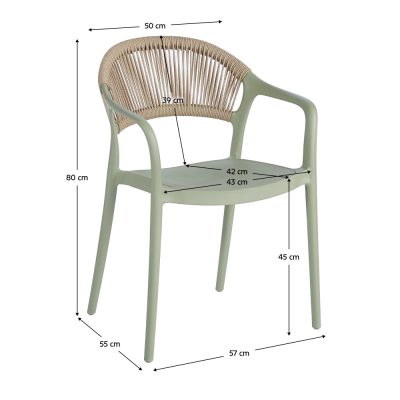 Anyag: műanyag/kötél Szín: zöld/bézs Méretek (SzxMéxMa): 57x60x81 cm Ülés magassága: 45 cm Ülés mélysége: 42 cm Ülés szélessége: 43 cm Háttámla magassága: 32 cm Háttámla szélessége: 50 cm Teherbírás: 100 kg Súly: 5,5 kg Étkezőszék Kerti szék Rakásolható Kültérbe és beltérre egyaránt alkalmas Összeszerelve szállítva