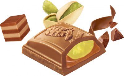 Tejcsokoládé tábla mogyoró pralinéval és pisztácia marcipánnal töltve.