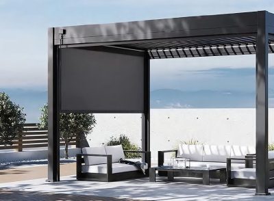 A bioklimatikus pergolák maximális kihasználása érdekében alumínium szerkezetű és textilén töltetű paraván formájában is kínálunk kiegészítőket, amelyek védelmet nyújtanak a szél ellen, és egyben kellemes árnyékot teremtenek.