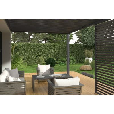 A bioklimatikus pergolák szürke RAL 7016 színben pompáznak, matt felülettel, amely elegáns megjelenést kölcsönöznek bármilyen kültéri térnek. A panel és a vízszintes lécek minőségi alumíniumból készülnek, amelyek porfestékkel vannak kezelve, így garantált a tartósság és az időjárási viszontagságokkal szembeni ellenállás.