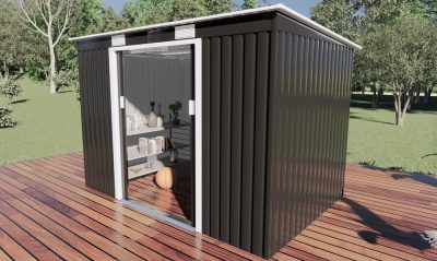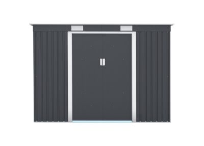 A sötétszürke szín és a letisztult vonalvezetés modern megjelenést kölcsönöz, amely harmonikusan illeszkedik bármilyen kertkörnyezetbe. A dupla tolóajtó könnyű hozzáférést biztosít, és helytakarékosan nyitható, így a kisebb kertekben is előnyös megoldás.