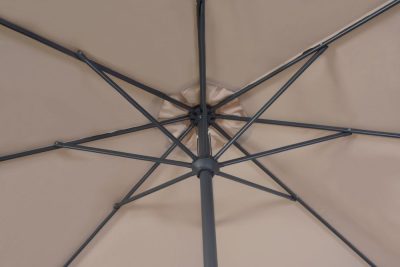 Nagy, tágas, nyolckarú napernyő modern dizájnnal és masszív fém konstrukcióval.