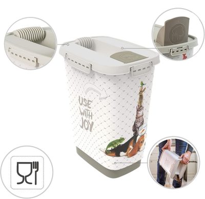 A műanyagból készült táptartó száraz eledel tárolására alkalmas. A kihajtható fedélen keresztül egyszerűen adagolható a táp kedvence számára. A tartó űrtartalma 10 liter, mely 4,5 kg táp tárolását teszi lehetővé. Az ergonomikus formának köszönhetően igazán kényelmes a használata. A táptartó mosogatógépben is mosható.