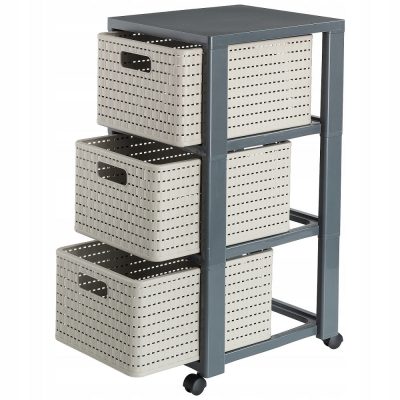 A rattan hatású háromszintes komód kitűnő tárolási lehetőségeket nyújt. Minden doboza 18 literes űrtartalommal rendelkezik. A könnyű mozgatás érdekében felszerelték a terméket kerekekkel is.