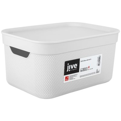 A Jive Deco sorozatnak különböző méretű dobozai vannak. Az 5 liter űrtartalommal rendelkező tároló nagyon praktikus hiszen fedéllel rendelkezik. Fogantyúinak köszönhetően egyszerű a mozgatása is. A tároló környezetbarát összetevőkből készült. A különböző dobozok összeillenek, egymásra tehetőek.