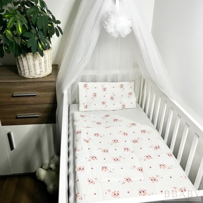 A Rózsaszín Felhők 2 részes babaágynemű szett különösen puha, légies tapintásával és szerethető mintáival olyan környezetet teremt, ahol minden kislány örömmel hajtja álomra a fejét.