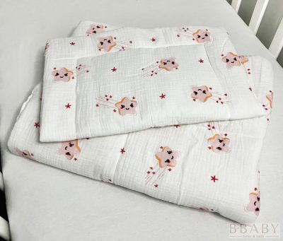 A szett tartalma egy 70×90 cm-es paplan és egy 40×50 cm-es lapos párna, melyek fix huzatos kialakítással készülnek – a töltet be van varrva a huzatba, így használat közben nem mozdul el. A 100% természetes pamut duplagéz szövet kiválóan szellőzik, nem irritálja a baba bőrét, míg az antiallergén poliészter vatta biztosítja a puhaságot és a megfelelő alátámasztást.