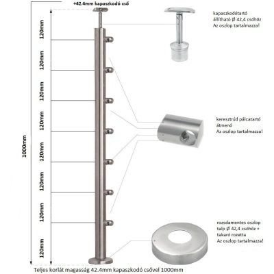• Rozsdamentes korlát pálcás oszlop 7 sor (talpra szerelt) kör profil Inox