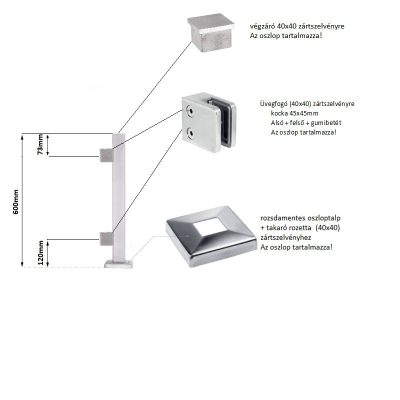 Rozsdamentes üvegkorlát 1 db oszlop.
