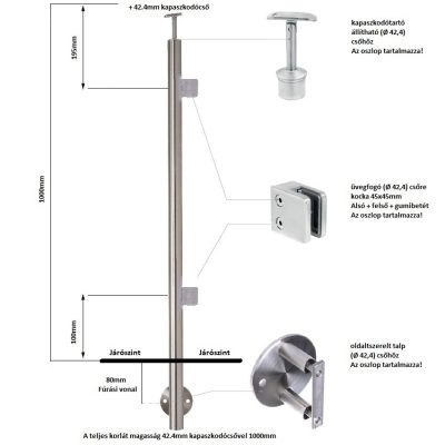 Csak laminált(VSG) üveget lehet szerelni korlátnak. Ennél az oszlop típusnál a javasolt üveg magasság egyenes szakasznál: 798 mm ferde szakasznál: 850 mm