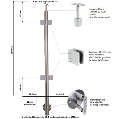 Csak laminált(VSG) üveget lehet szerelni korlátnak. Ennél az oszlop típusnál a javasolt üveg magasság egyenes szakasznál: 798 mm ferde szakasznál: 850 mm
