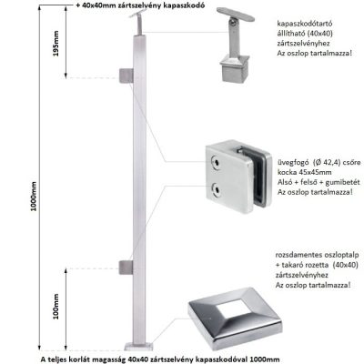 Rozsdamentes üvegkorlát oszlop / talpra szerelt, indító, záró, kocka profil