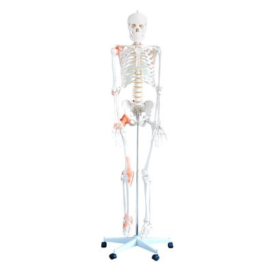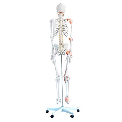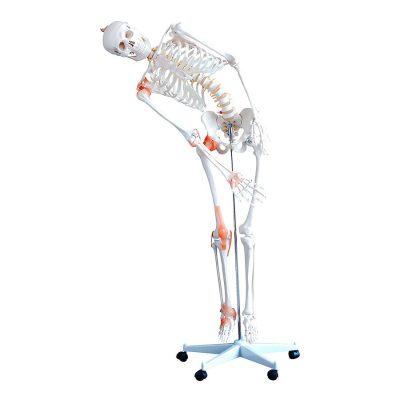 Ez az életnagyságú emberi csontváz nemcsak rugalmas gerincoszloppal rendelkezik, hanem részletesen bemutatja az egyes szalagok felépítését is 6 ízületen.